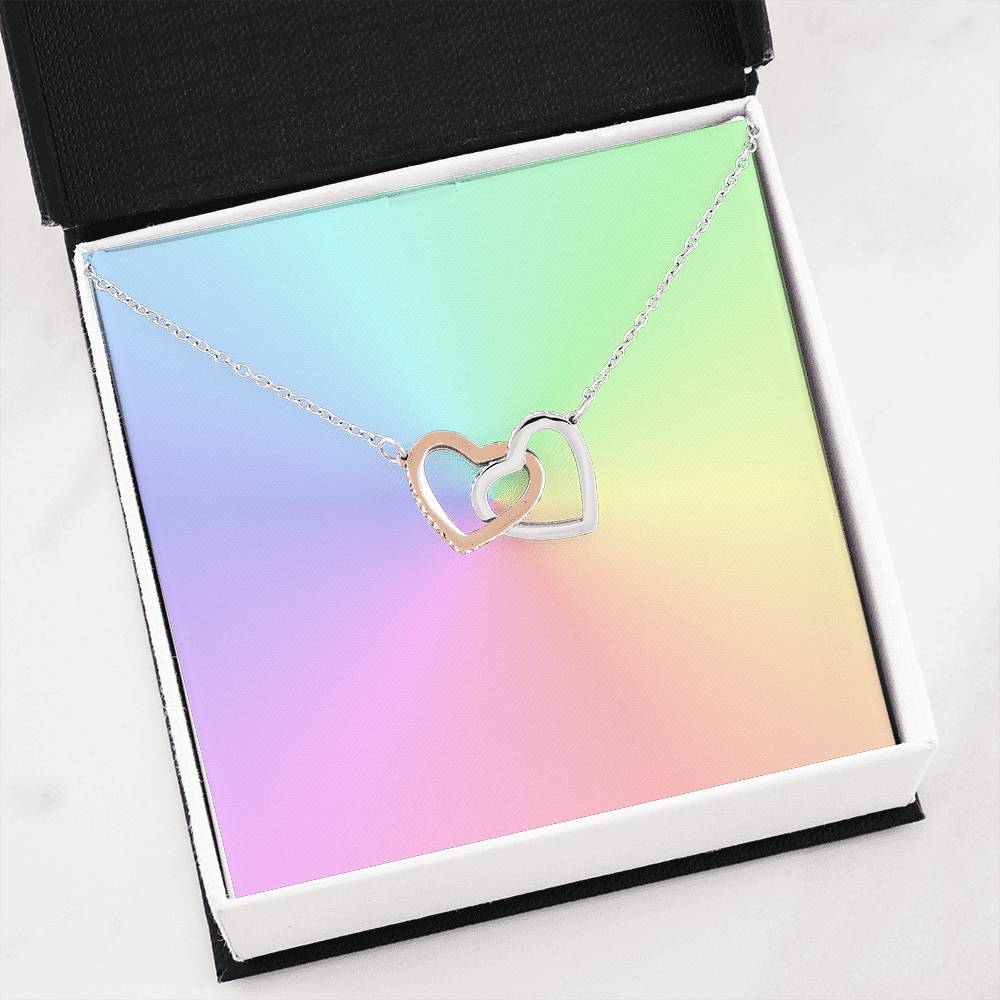 Two hearts embellished with Cubic Zirconia stones, interlocked together as a symbol of never-ending love. Made with high quality polished surgical steel. Cable chain measures 18 inches with a 4 inch extension, and fastens with a lobster clasp. Pendant Dimensions: -Height 0.6" (1.5cm) -Width 1.1" (2.7cm)